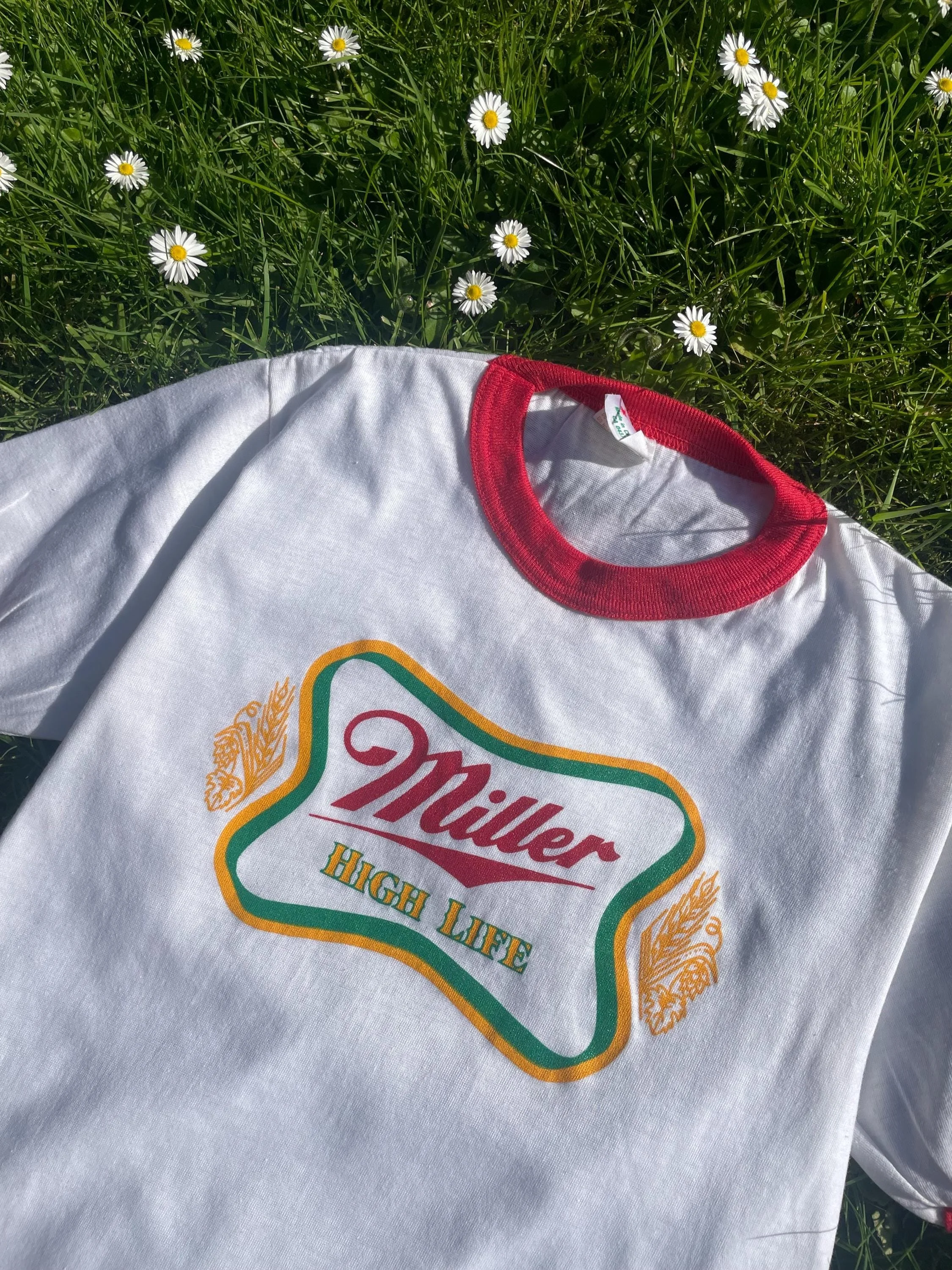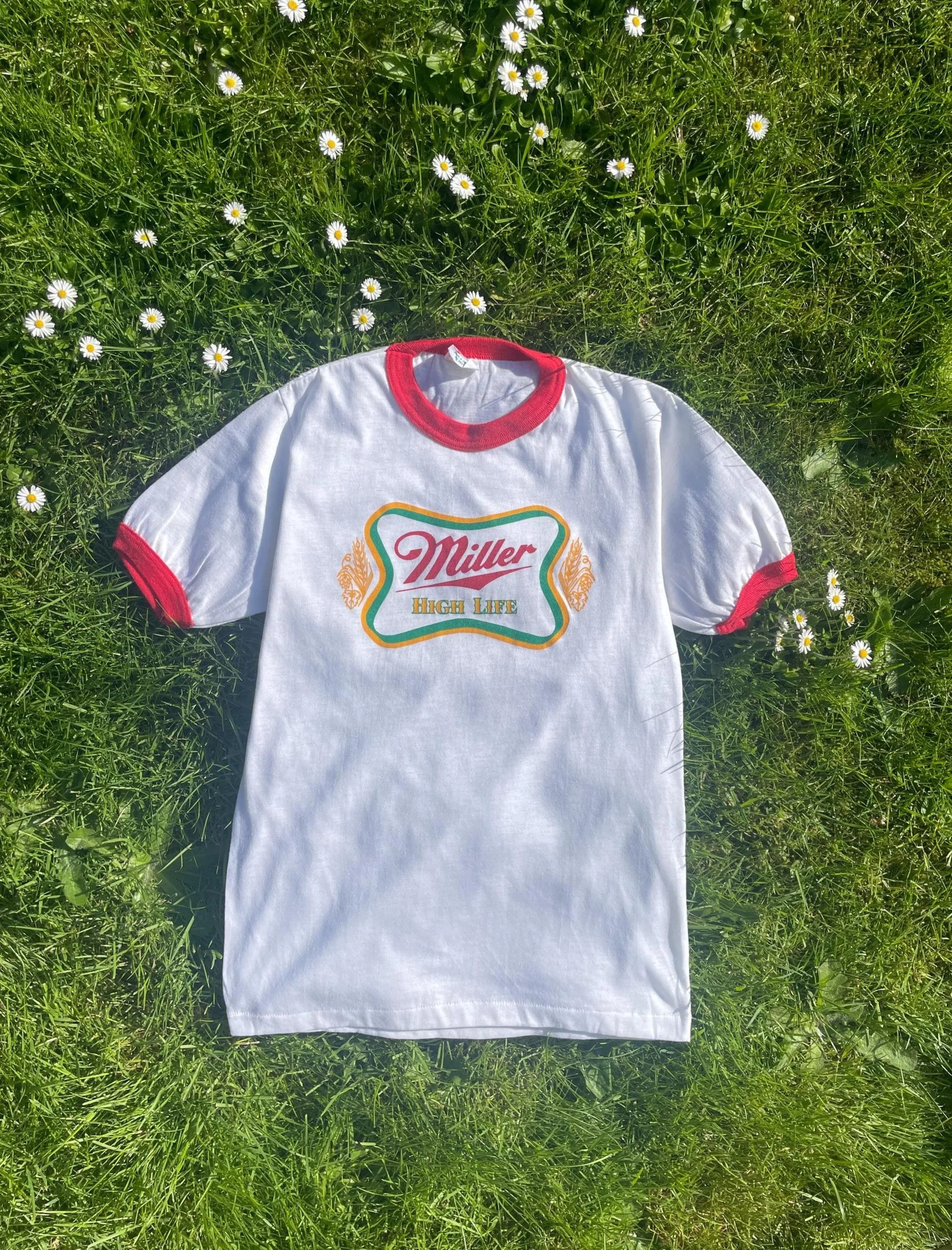 Shop › 80s Single Stitch 50/50 Miller High Life Vintage Ringer Tee Image 1 of 4 Image 2 of 4 Image 3 of 4 Image 4 of 4 80s Single Stitch 50/50 Miller High Life Vintage Ringer Tee $65.00 I <3 beer. vintage Miller High Life ringer. single stitch 50/50 poly cotton Evergreen Sportswear tee, made in Canada. era: 1980'scondition: like new - no notable flaws measurements: marked size small - pit to pit: 16.25" / shoulder to shoulder: 14.5" / length: 24" Add To Cart Added! I <3 beer. vintage Miller High Life ringer. single stitch 50/50 poly cotton Evergreen Sportswear tee, made in Canada. era: 1980'scondition: like new - no notable flaws measurements: marked size small - pit to pit: 16.25" / shoulder to shoulder: 14.5" / length: 24"