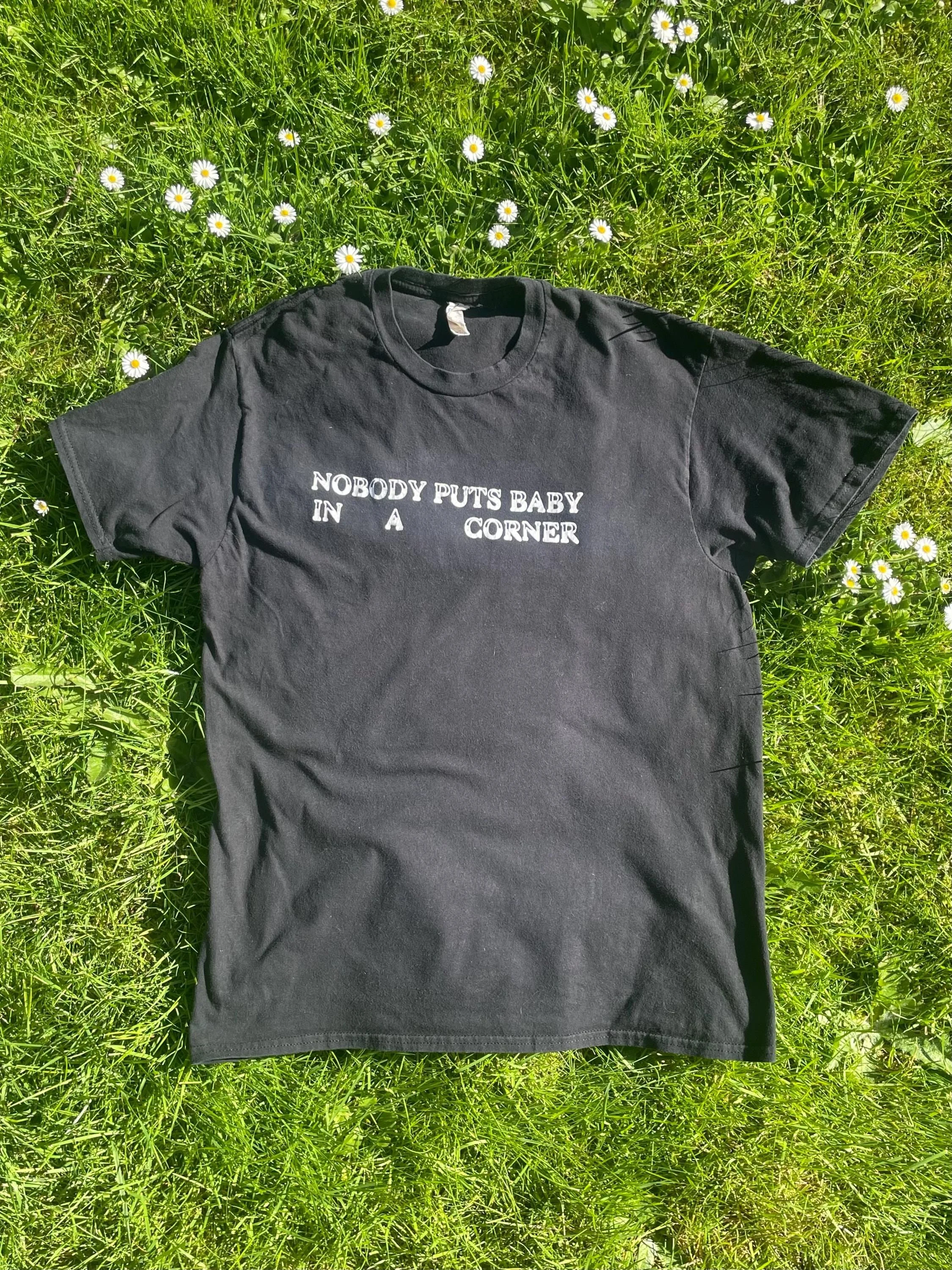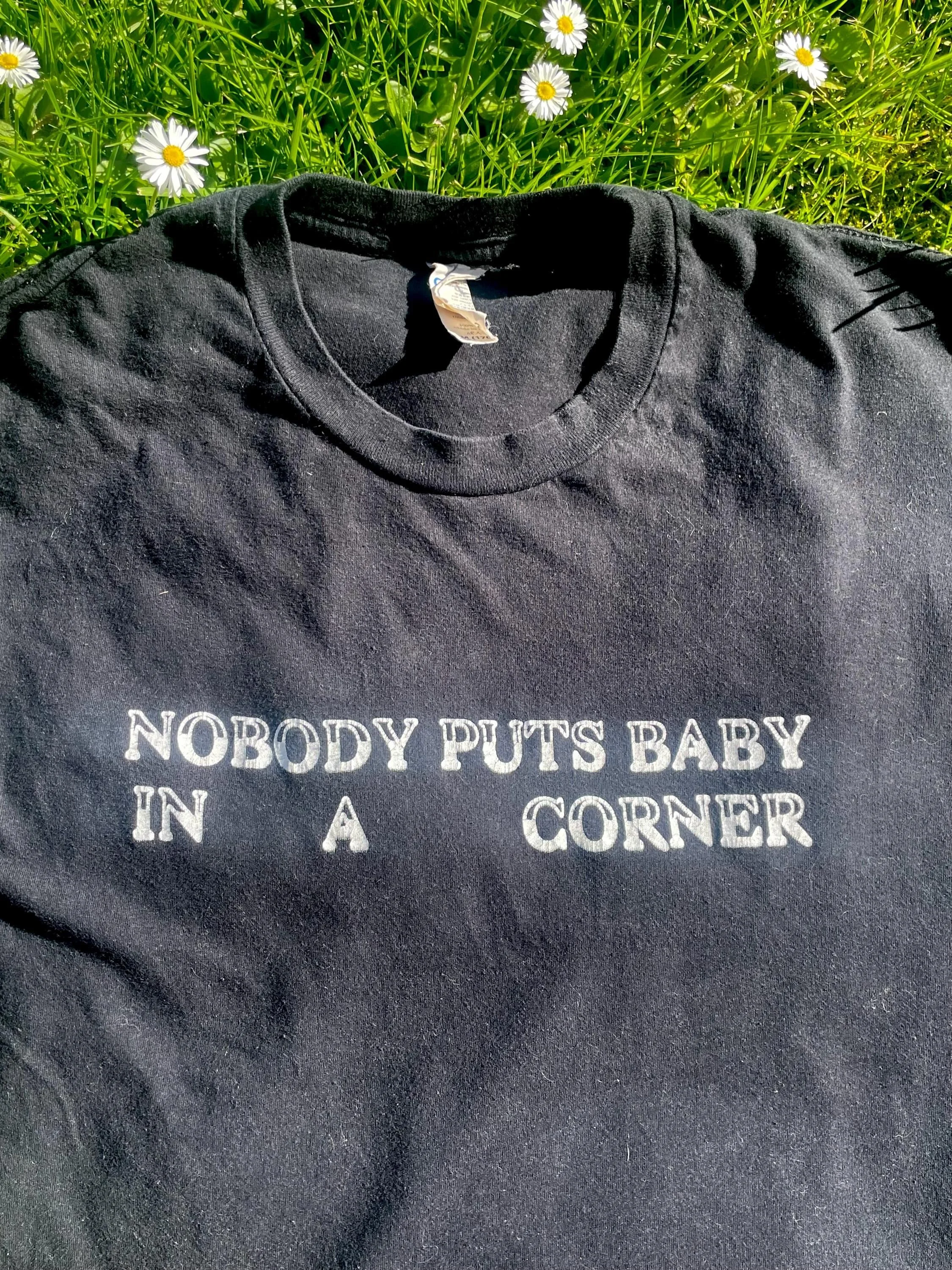 some have said I look like baby. could never be me… no way I’m carrying a watermelon to a function exclusively for those in an oppressed set of circumstances and expect to be acknowledged for my efforts while knowing my character and lived experience have been judged based on my current socioeconomic standing like I’d pull up to a more appropriate function for me to attend with an open heart an understanding of hierarchical dynamics and a love for dance and if I get put in the corner I’ll be upset with the reality of class structures for a hot sec but eventually get over it start dancing by myself and hope that people might be like woah she must really love dance to be doing all that perhaps I can fw her? dirty dancing (the movie) isn’t for me but if it’s for you thats okay because we’re individuals with complex personal histories and we don’t need to like the same stuff so long as we’re trying our best to communicate our perspectives while being aware of each other’s humanity and capacity for change and that’s why I’m selling this shirt because maybe we could connect via the fact that I enjoy aspects of the tee and you enjoy aspects of the movie and you could put me on to why you think it’s a great movie and I could put you on to why I think it’s a dumb movie and both of our lenses might widen a bit for future movie watching jah feel?